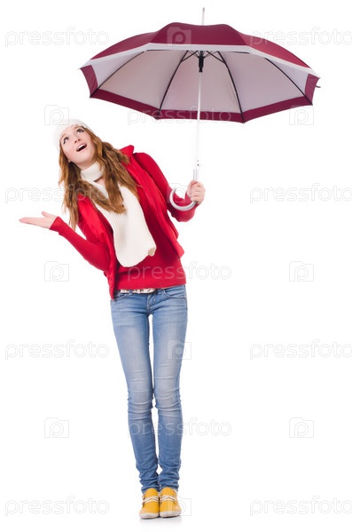Молодая женщина с зонтом на белом фоне