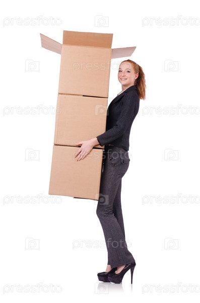 Деловая женщина с коробками на белом фоне