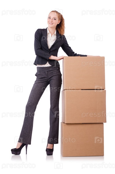 Деловая женщина с коробками на белом фоне
