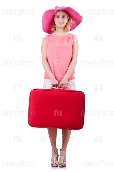 Женщина с багажом, изолированная на белом