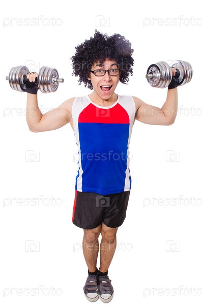 Забавный человек делает упражнения с гантелями