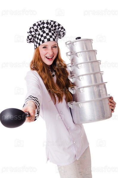 Молодая женщина-повар, изолированная на белом
