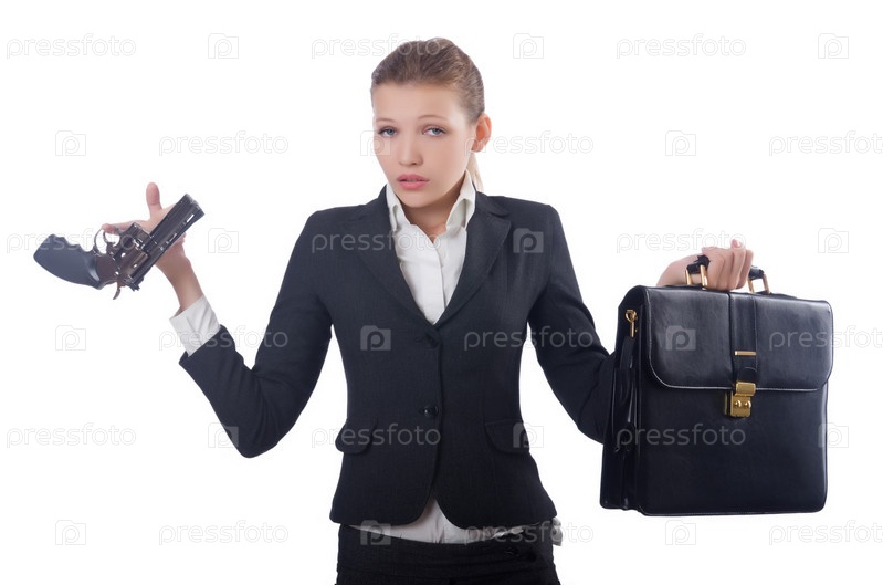 Деловая женщина с пистолетом на белом фоне