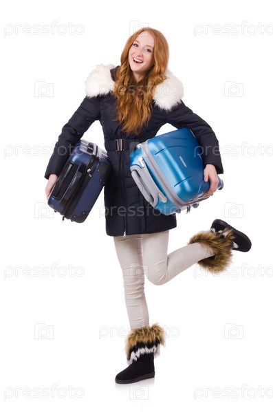 Женщина с багажом, изолированная на белом