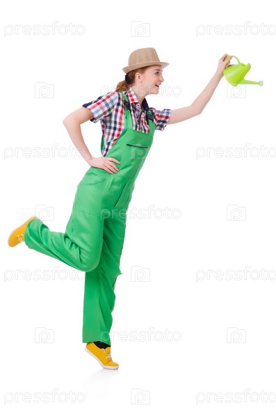 Молодая женщина с лейкой на белом фоне