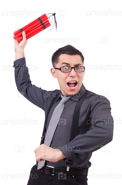 Бизнесмен с динамитом, изолированный на белом