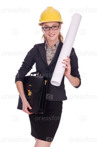 Молодой архитектор с чертежами на белом фоне