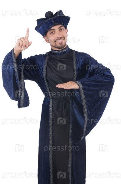Старый мастер боевых искусств в голубом кимоно на белом фоне