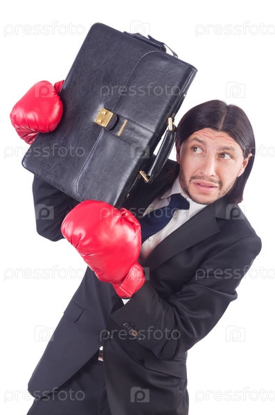 Бизнесмен в боксерских перчатках на белом фоне