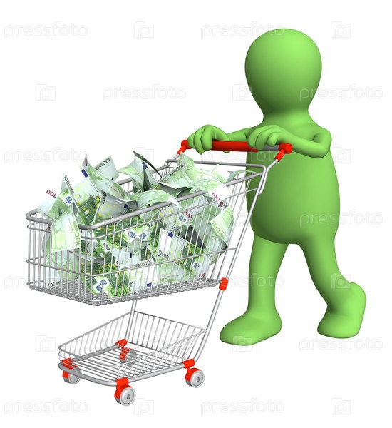 Человечек с магазинной тележкой, наполненной деньгами