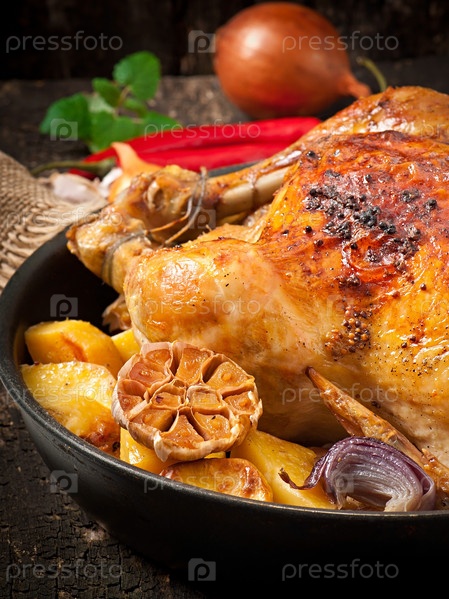 Запеченная целая курица с картофелем, чесноком и луком