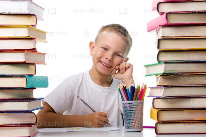 Портрет симпатичного молодого человека, сидящего среди кучи литературы и улыбающегося в камеру во время рисования