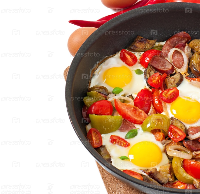 Яичница со свежими овощами и колбасой на белом фоне