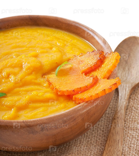 Крем-суп из тыквы в деревянной миске