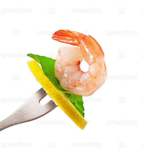 Креветка на вилке, изолированная на белом