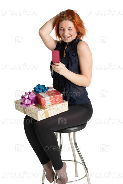 Счастливая улыбающаяся рыжая девушка с праздничными подарками сидит на стуле и разговаривает по телефону.Праздничные тарифы сотовой связи