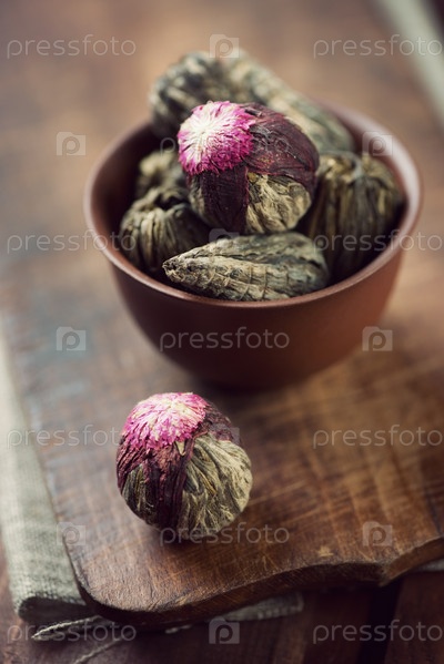 Керамическая пиала с шариками зеленого чая на деревянной поверхности