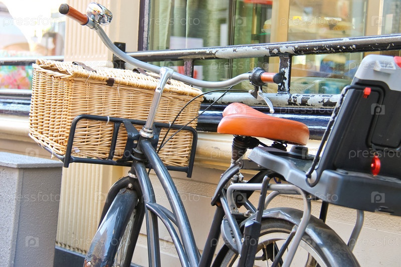 Велосипед с плетеной корзиной стоит у стены
