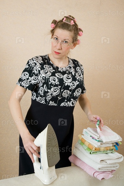 Женщина в бигудях на голове гладит белье