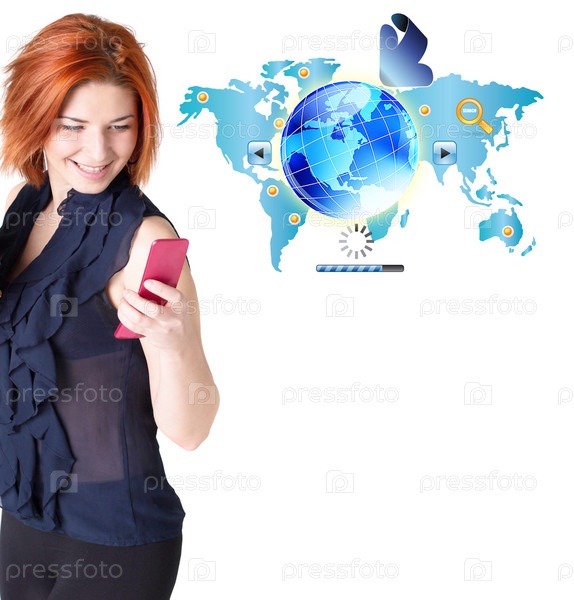 Счастливая улыбающаяся рыжая девушка отправляет смс по телефону.Праздничные тарифы сотовой связи