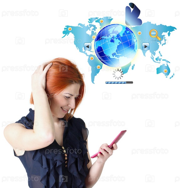 Счастливая улыбающаяся рыжая девушка отправляет смс по телефону.Праздничные тарифы сотовой связи