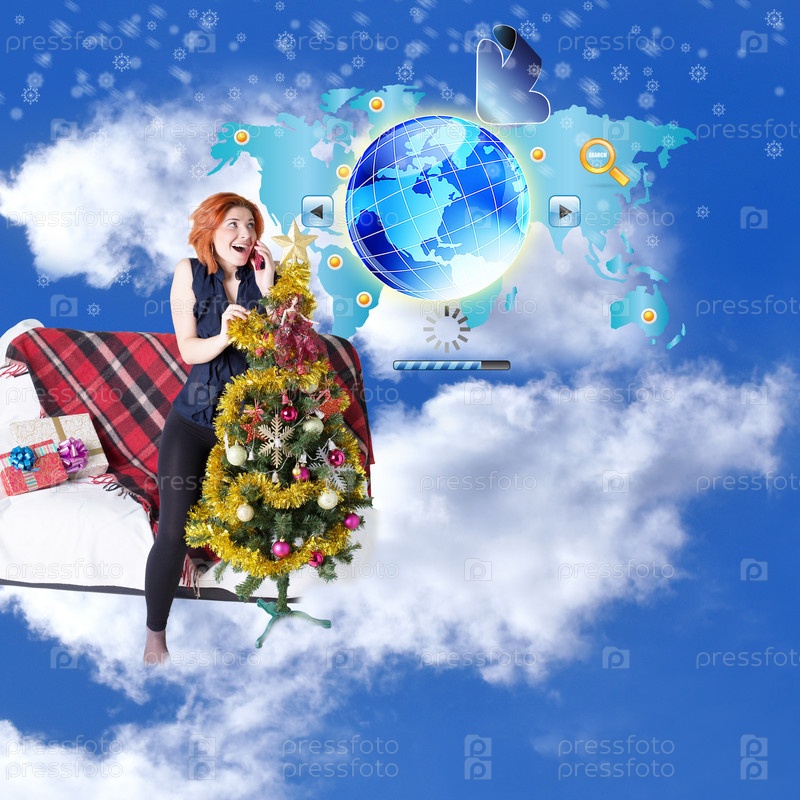 Счастливая улыбающаяся рыжая девушка с праздничными подарками на диване в Новогодние праздники разговаривает по телефону на голубом облачном небе.Праздничные тарифы мобильной связи