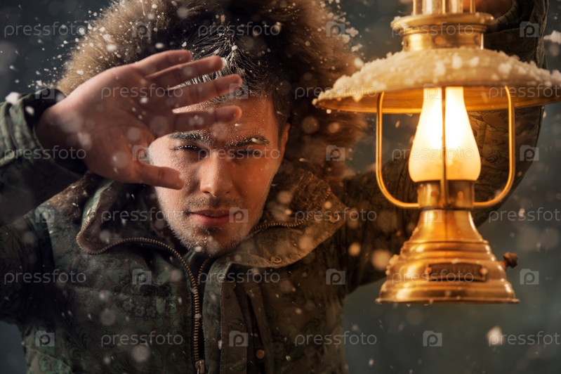 Мужчина с фонарем в метель