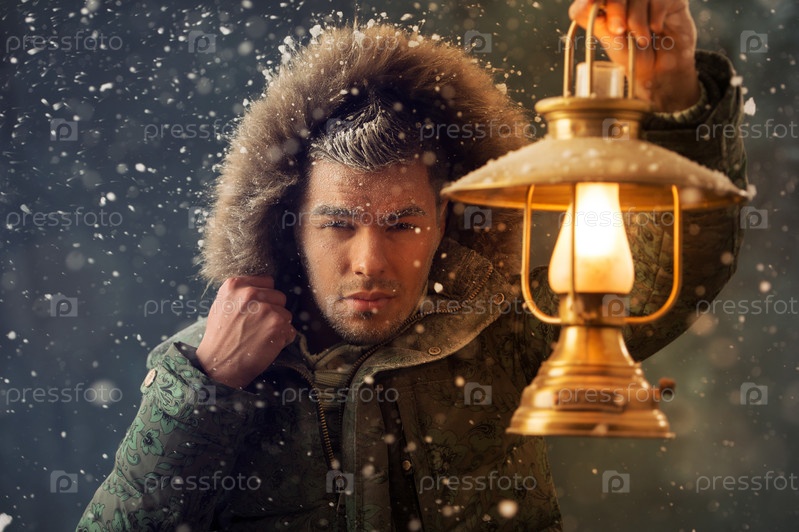 Брутальный мужчина с фонарем в метель