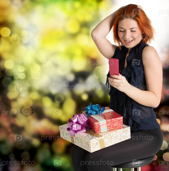 Счастливая улыбающаяся рыжая девушка с праздничными подарками сидит на стуле