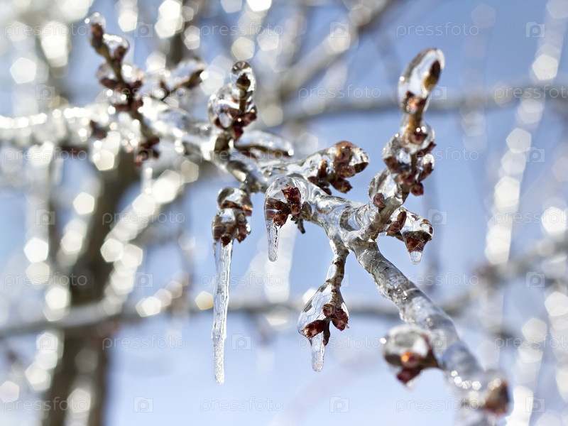 Обледенелая ветвь дерева в солнечном свете