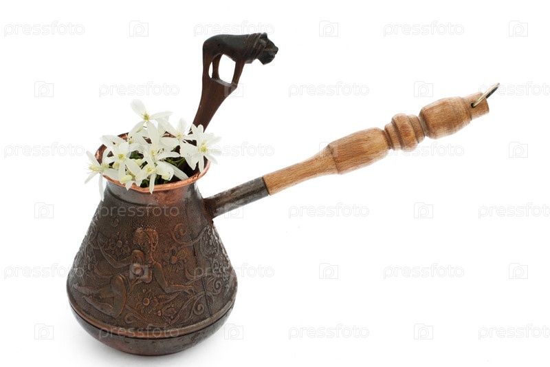 Медная турка с цветками липы, изолированная на белом фоне