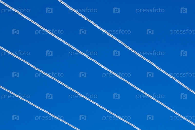 Линия электропередач в инее на фоне голубого неба