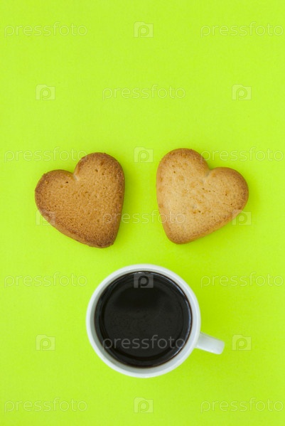 Чашка кофе и печенье в виде сердца на зеленом фоне
