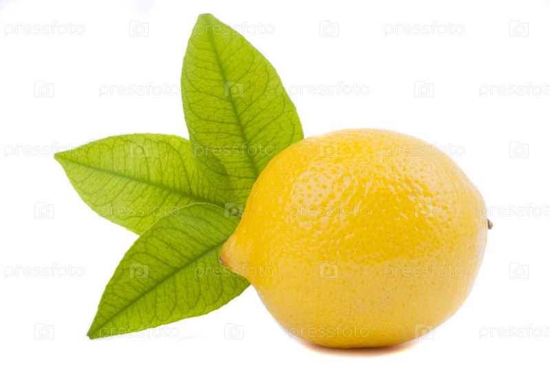 Лимон с листьями на белом фоне