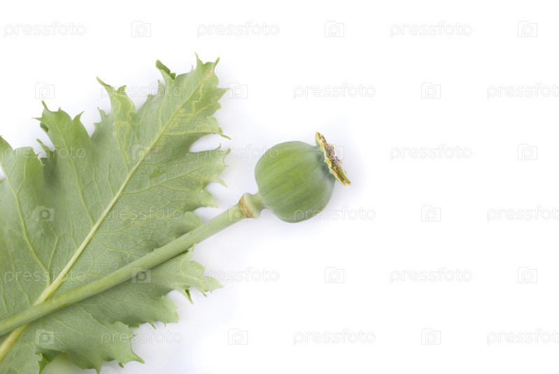Зеленая головка мака и листок на белом фоне