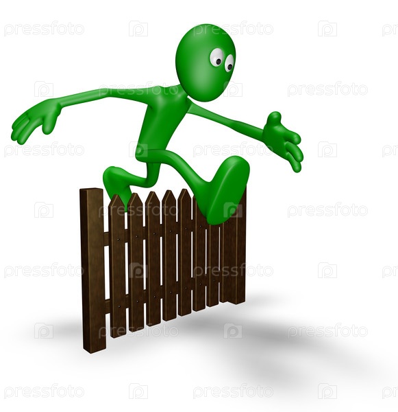 Маленький человек прыгает через забор - 3D иллюстрация
