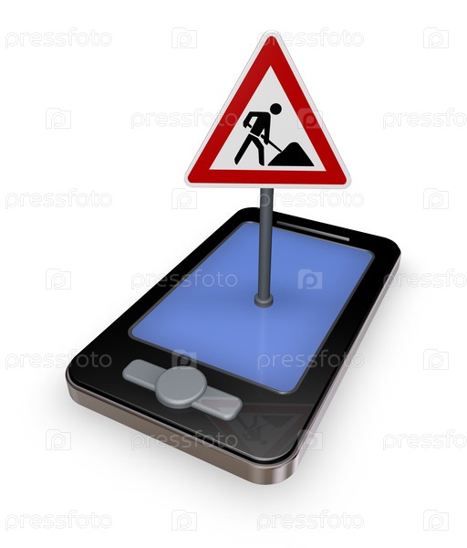Телефон с дорожным знаком на белом фоне - 3d иллюстрация