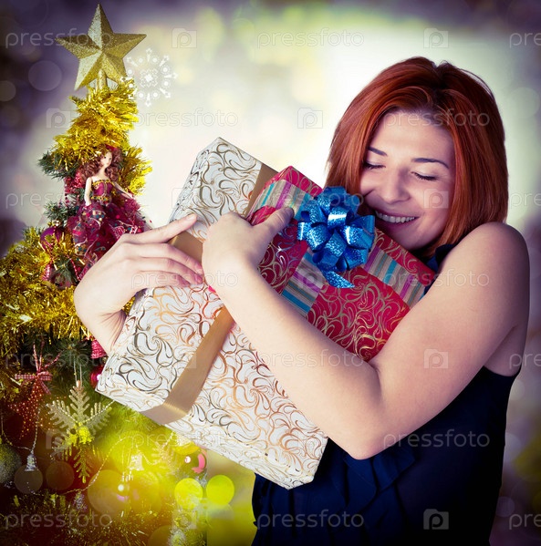 Счастливая рыжая девушка с подарками у новогодней елки