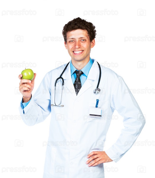 Доктор держит зеленое яблоко на белом фоне