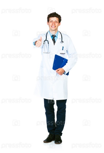 Портрет улыбающегося врача с планшетом, показывающего большой палец
