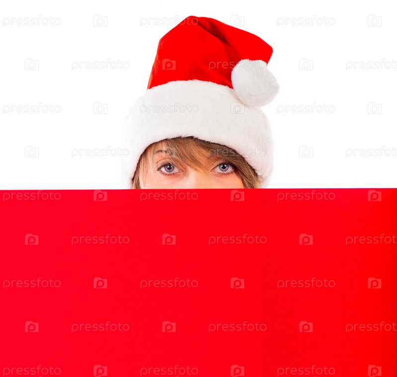 Улыбающаяся девушка в рождественском колпаке с красной табличкой на белом фоне