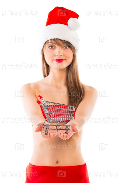Красивая девушка в шапке Санта-Клауса с магазинной тележкой на белом фоне