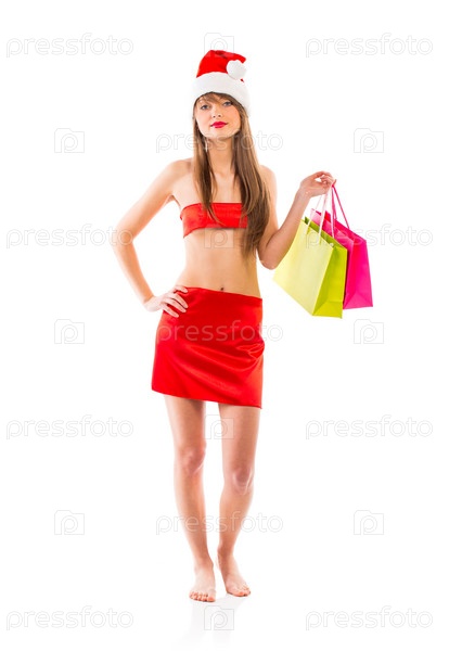Красивая девушка в шапке Санта-Клауса с пакетами на белом фоне