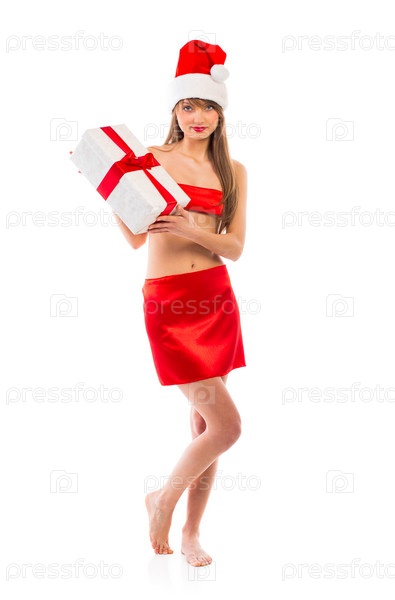 Красивая девушка Санта-Клаус с подарком, изолированная на белом фоне