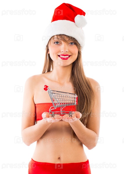 Красивая девушка Санта-Клаус с тележкой для шоппинга на белом фоне