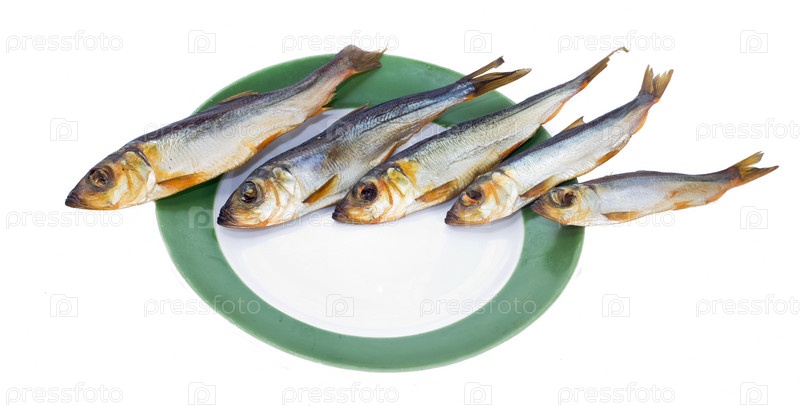 Копченые сардины на тарелке на белом фоне