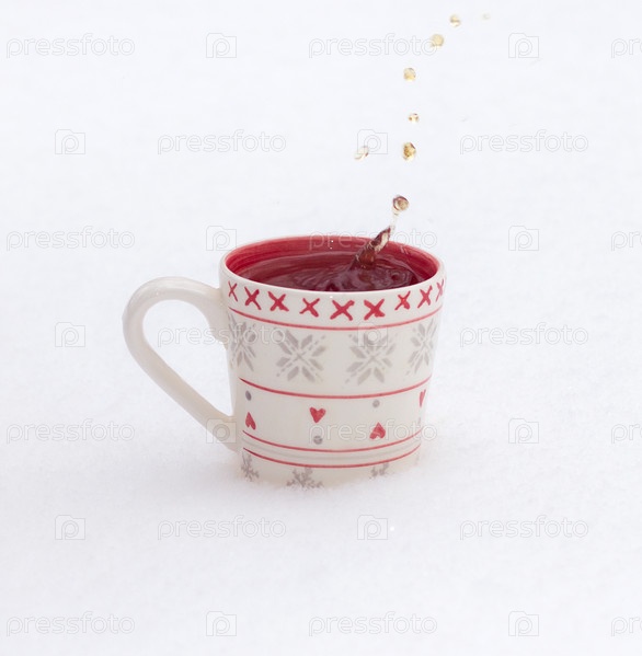 Белая чашка чая на открытом воздухе зимой