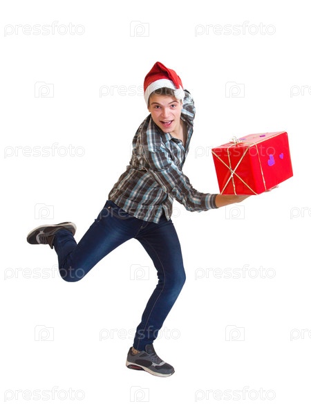 Подросток в новогодней шапке с подарком