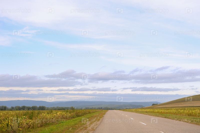 Дорога вдоль поля с подсолнухами на закате в конце лета