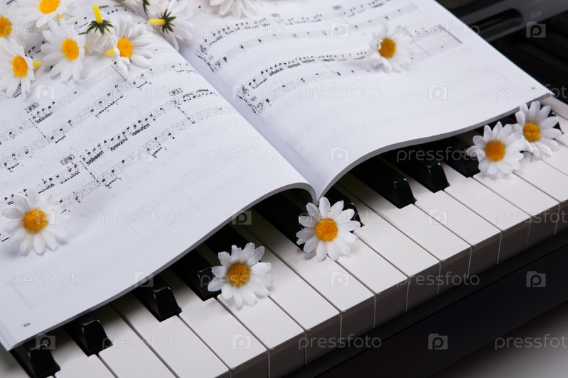 Клавиши пианино и музыкальные ноты с цветами